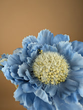 Deze verfijnde zijden scabiosa heeft een luchtige en elegante uitstraling. De tak bestaat uit drie bloemhoofden in een zacht blauwgrijze tint met een subtiel groen hart. Door de slanke stelen en natuurlijke bladstructuur oogt deze bloem licht en speels, perfect voor moderne en romantische arrangementen.