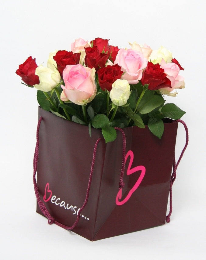 Vous pouvez commander ces roses dans les couleurs en rouge, blanc et rose dans un joli sac chez Thuisbloemist et le faire livrer.